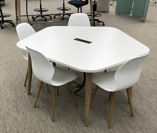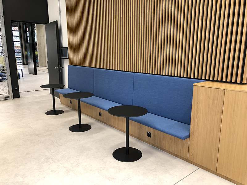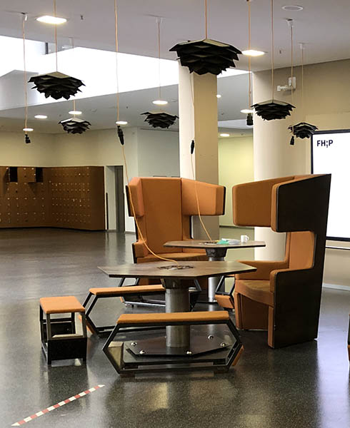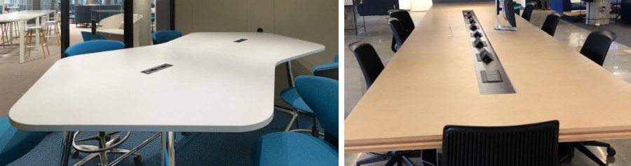 Bei solchen Tischen und Sofas sind die Stromkabel im Möbelstück integriert und somit gut versteckt. Es kann sinnvoll sein, die Möbelausstattung an einigen Stellen gerade so zu planen, dass die Stromversorgung versteckt wird. In einem größeren Lernraum können z.B. (maßgeschneiderte) Sitzblöcke mit dem Ziel eingebaut werden, Stromkabel zu verstecken. So ist es möglich, zusätzliche Lernplätze anzubieten und gleichzeitig notwendige Kabelverbindungen zu verstecken. Zur Not können temporär auch Matten über Stromkabel gelegt werden. Dies bietet sich insbesondere für kurze Strecken und wenige frequentierte Bereiche im Raum an (also keine Durchgänge).