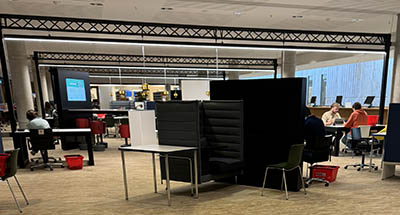 • Bodentanks: Bodentanks verstecken Stromanschlüsse. Sie sind jedoch auch oft schnell Stolperfallen. Daher sollte überlegt werden, ob Bodentanks frei zugänglich genutzt werden können oder nur als Versorgungsstellen für andere Lösungen genutzt werden, z.B. für Stromsäulen, für Mobiliar mit Stromanschlüssen oder für Lernboxen und -nischen.