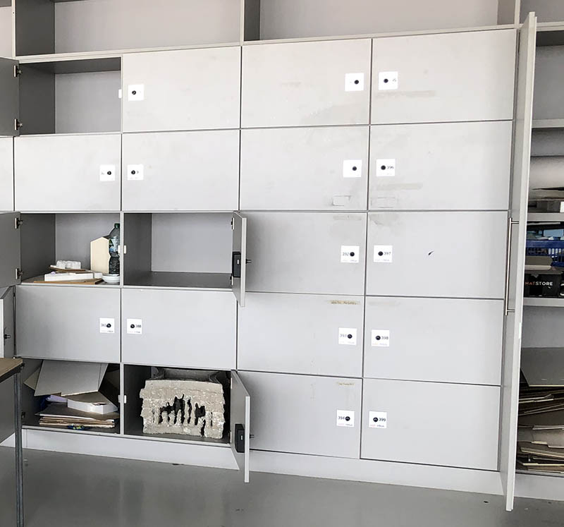 - Studierende beschäftigen sich im Rahmen von Projekten und Blockveranstaltungen oft über mehrere Tage oder Wochen an einer Aufgabe. Dabei entstehen physische Artefakte (Bauten, Skizzen, Flipchart-Bögen usw.), die zwischengelagert werden müssen. Durch Schließfächer können mehrere Studierendengruppen zeitversetzt im selben Raum arbeiten, ohne dass eine Gruppe die Ergebnisse einer anderen Gruppe durcheinanderbringt.