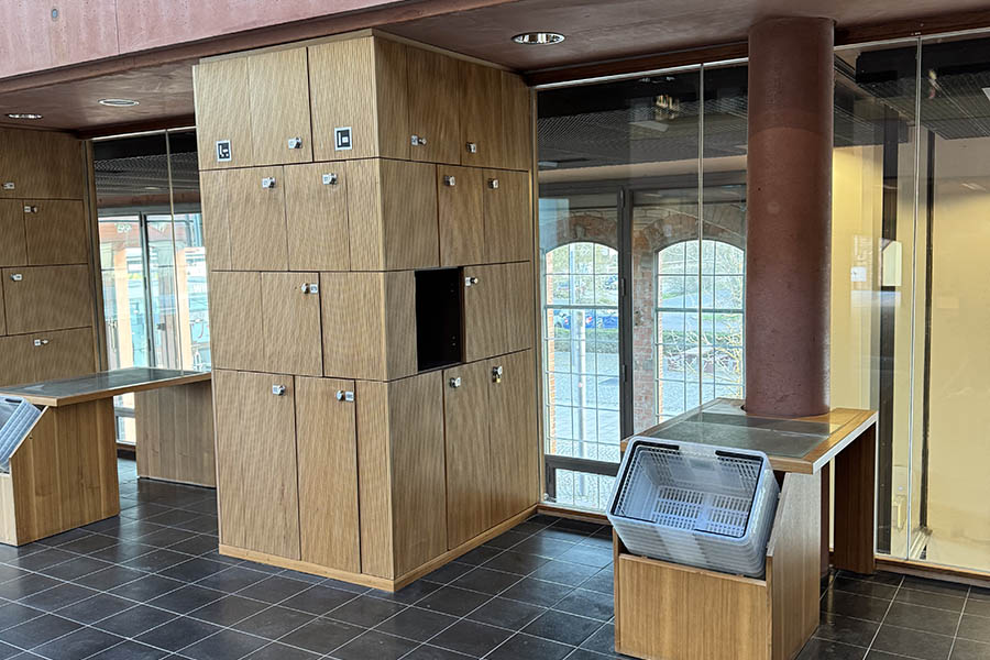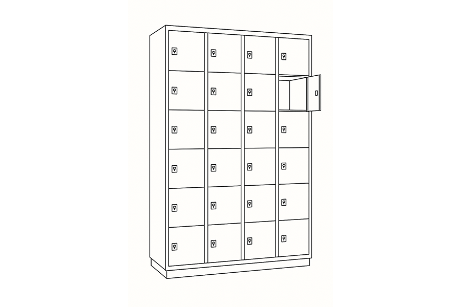 Schließfächer ermöglichen es, Wertgegenstände temporär wegzuschließen. Dies kann erforderlich sein, wenn Studierende ihre Taschen zeitweise nicht in Räume mitnehmen können (z.B. in Bibliotheken oder in Labore), mehr Bewegungsfreiheit auf dem Campus benötigen (nicht immer alles Mitschleppen) oder Dinge über Nacht auf dem Campus lassen möchten. Zudem können Schließfächer als flexible Verleihstation für Equipment (Kameras, Moderationskoffer) eingesetzt werden, z.B. durch Vergabe von Schlüsseln oder Zugangscodes. Moderne Schließfachsysteme verriegeln die Türen digital gesteuert, so dass über Studierendenkarte oder Codes eine Tür geöffnet bzw. geschlossen wird. Schließfächer können auch mit Lademöglichkeiten für Smartphones ausgestattet werden. Eine weitere wichtige Funktion von Schließfächern kann das Zwischenlagern von Projektergebnissen sein, z.B. Skizzen oder Aufbauten.