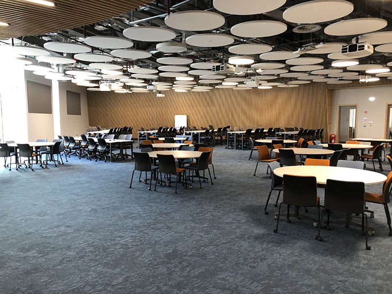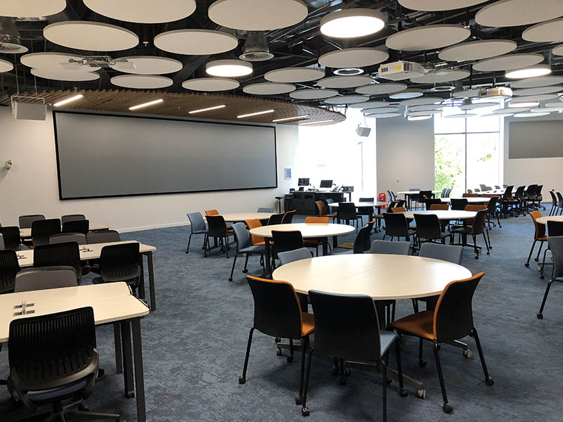 - Ein Hörsaal mit Gruppentischen unterstützt den nahtlosen Wechsel zwischen verschiedenen Lernaktivitäten, ohne dass ein Raumwechsel nötig wird.