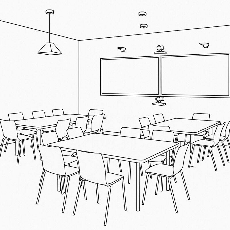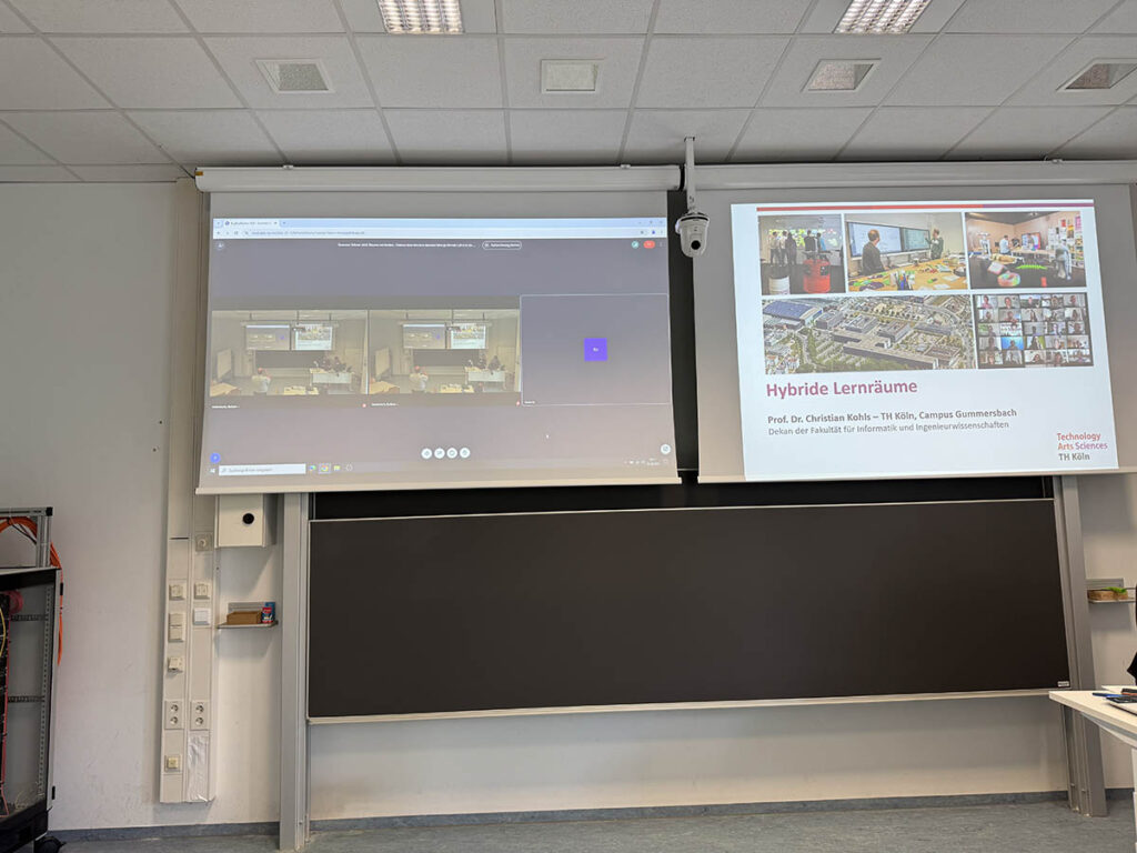 Ein Videoseminarraum erlaubt hybride Lehre mit Präsenz- und Online-Teilnehmenden. Er ist mit mehreren Kameras, Deckenmikrofonen und interaktiven Displays ausgestattet und ermöglicht gleichberechtigte Interaktion.