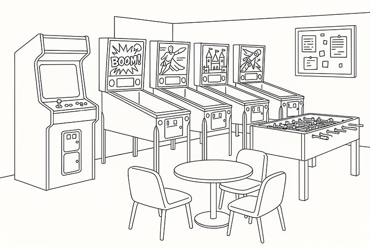 Arcade-Automaten oder Spieltische im Lernkontext bieten spielerische Entspannung, fördern soziale Interaktion und lockern das Lernumfeld auf. Sie lassen sich in studentischen Aufenthaltsbereichen, Foyers oder Pausenzonen integrieren und können retro-ästhetisch oder modern gestaltet sein.