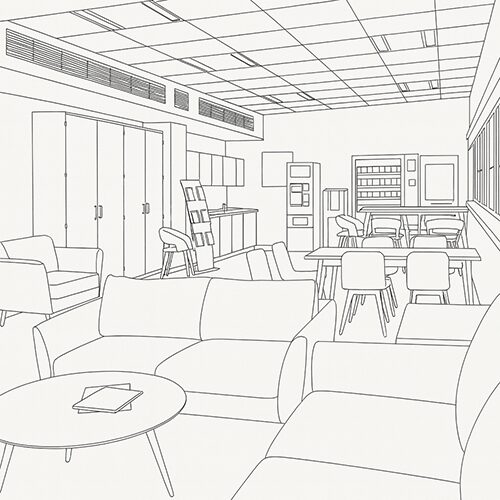 Ein studentischer Aufenthaltsraum ist ein offener, wohnlicher Raum zur informellen Nutzung. Er lädt zum Entspannen, Verweilen, Arbeiten, Spielen oder Snacken ein und unterstützt das soziale Leben auf dem Campus.